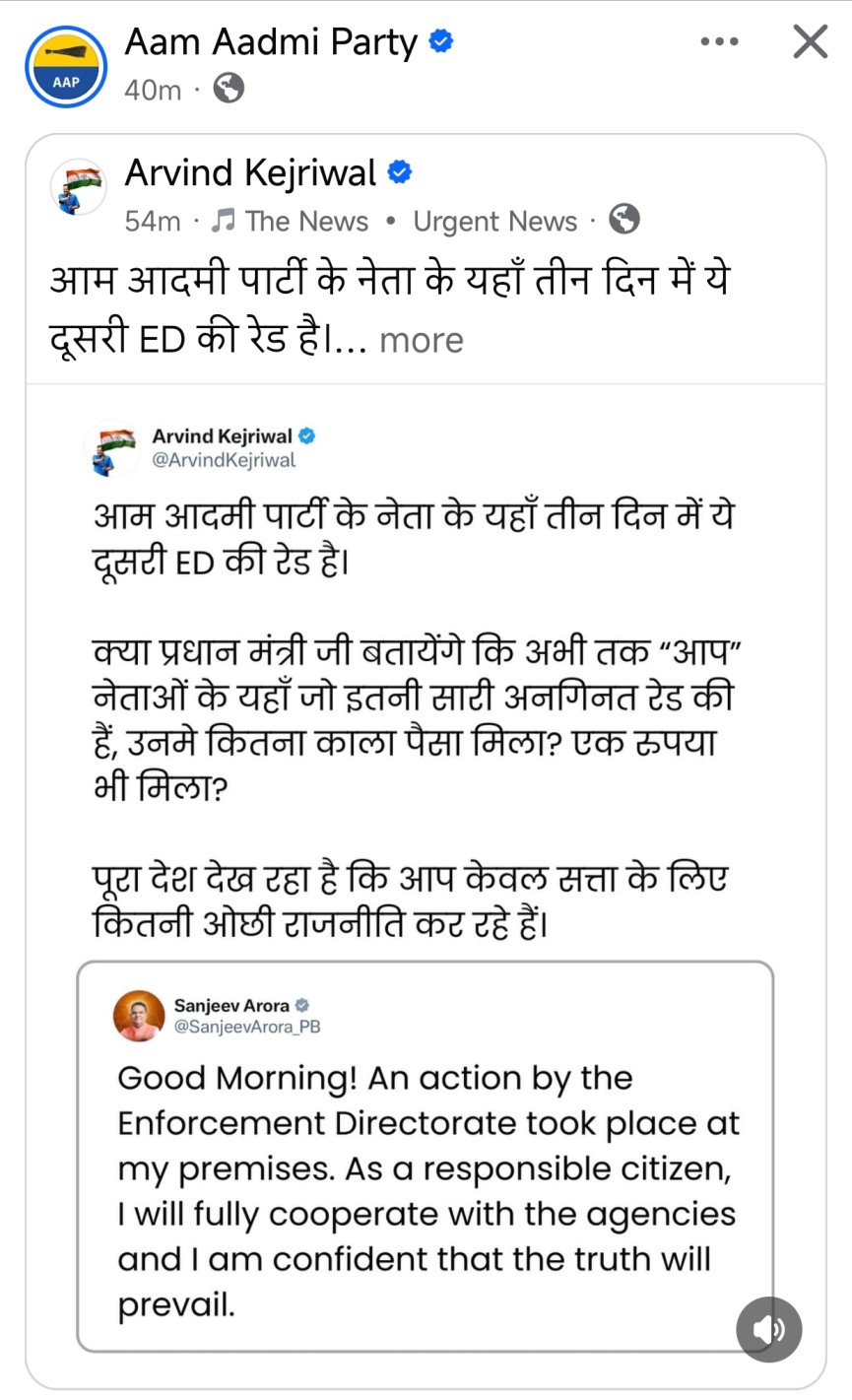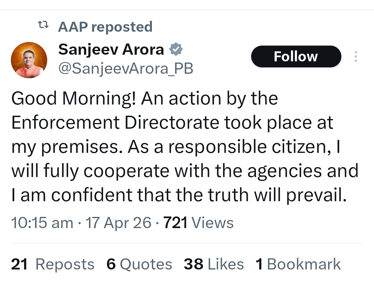 मंत्री संजीव अरोड़ा ने अपने एक्स हैंडल पर लिखा- मैं देश का जिम्मेदार नागरिक हूं और एजेंसियों के साथ पूरा सहयोग करूंगा। मुझे विश्वास है कि सच्चाई सामने आएगी।