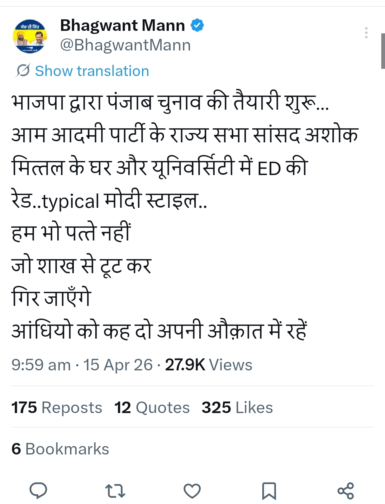 Ed-Raids-Aap-Rajya-Sabha-Mp-Ashok-Mittal-s-House-Chief-Minister-Bhagwant-Mann-Takes-A-Dig-At-Bjp-In-A-Post
