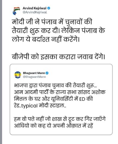 Aap ਰਾਜਸਭਾ ਸਾਂਸਦ ਅਸ਼ੋਕ ਮਿੱਤਲ ਦੇ ਘਰ Ed ਦੀ ਰੇਡ-ਮੁੱਖਮੰਤਰੀ ਭਗਵੰਤ ਮਾਨ ਨੇ ਪੋਸਟ ਪਾਕੇ ਭਾਜਪਾ ਤੇ ਕਸਿਆ ਤੰਜ