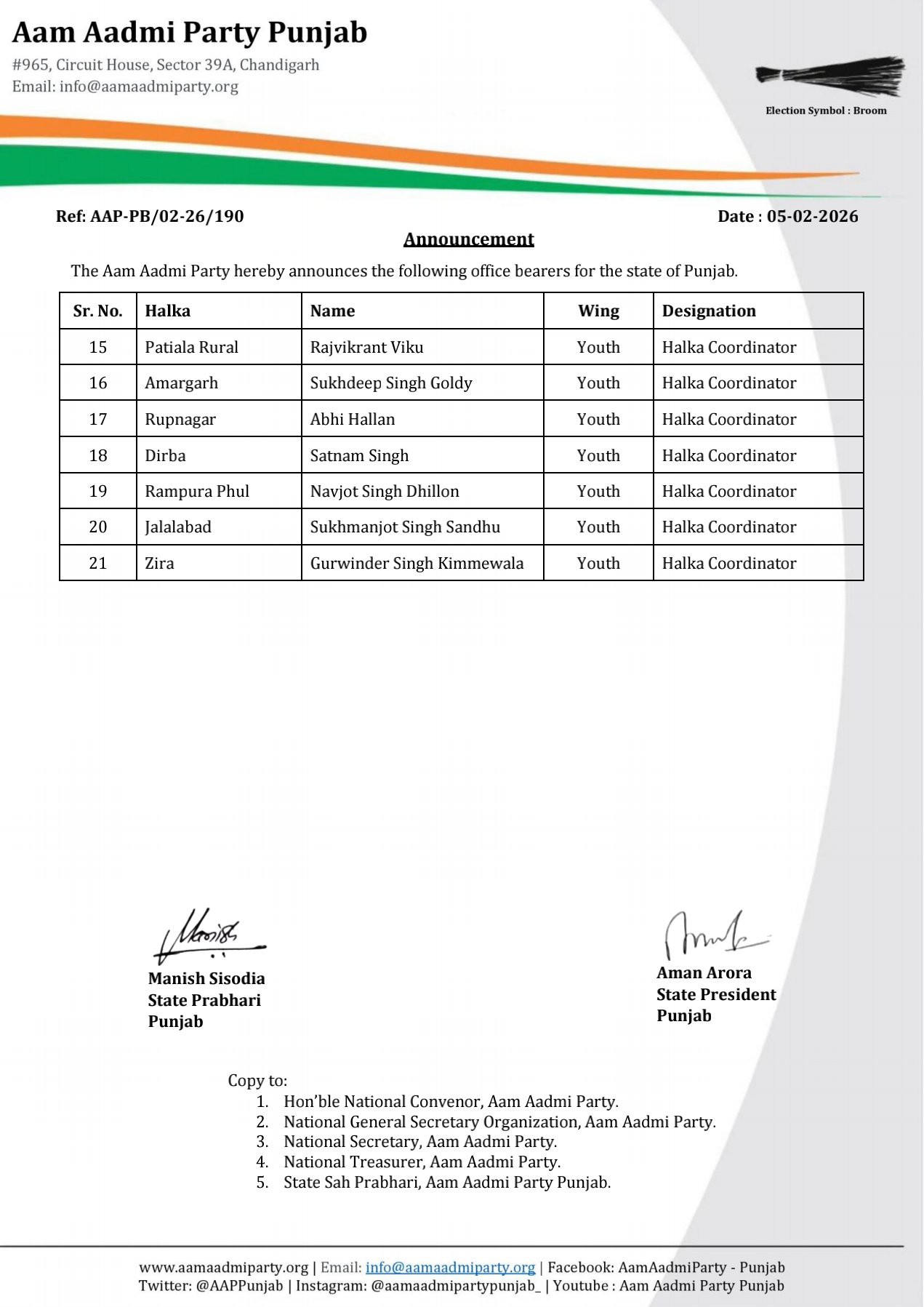 Aap-Punjab-Announces-Key-Organisational-Appointments-Across-State-District-And-Halka-Levels