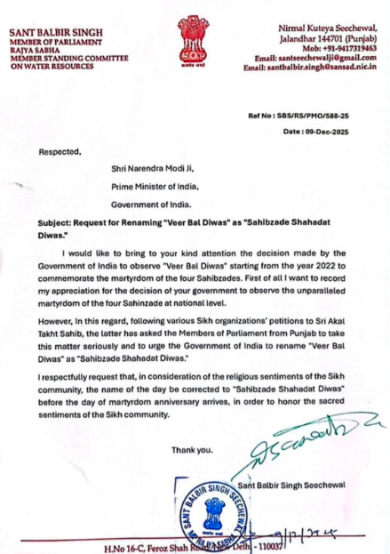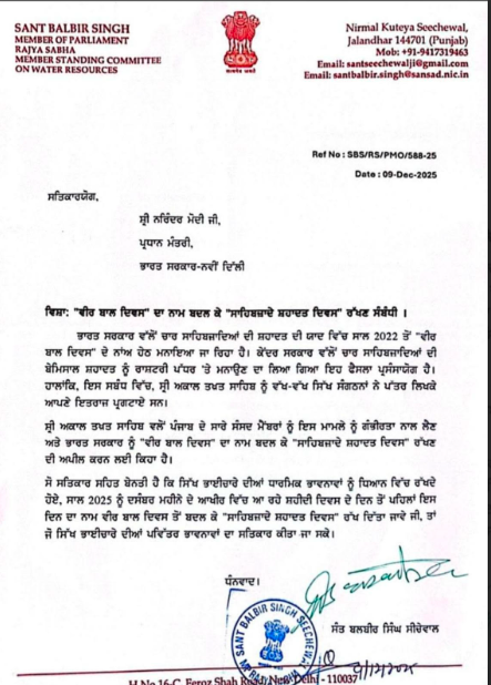 ਪੰਜਾਬ ਦੇ ਮੁੱਖ ਮੰਤਰੀ ਭਗਵੰਤ ਮਾਨ ਦੀ ਸਰਕਾਰ ਨੇ ਇੱਕ ਵਾਰ ਫਿਰ ਕੇਂਦਰ ਦੀ ਭਾਜਪਾ ਸਰਕਾਰ ਦੀ ਆਲੋਚਨਾ ਕੀਤੀ ਹੈ। ਸੰਸਦ ਮੈਂਬਰ ਸੰਤ ਬਲਬੀਰ ਸਿੰਘ ਸੀਚੇਵਾਲ ਨੇ ਪ੍ਰਧਾਨ ਮੰਤਰੀ ਨਰਿੰਦਰ ਮੋਦੀ ਨੂੰ ਇੱਕ ਪੱਤਰ ਲਿਖ ਕੇ ਮੰਗ ਕੀਤੀ ਹੈ ਕਿ 'ਵੀਰ ਬਾਲ ਦਿਵਸ' ਦਾ ਨਾਮ ਬਦਲ ਕੇ 'ਸਾਹਿਬਜ਼ਾਦੇ ਸ਼ਹਾਦਤ ਦਿਵਸ' ਰੱਖਿਆ ਜਾਵੇ। ਪੰਜਾਬ ਸਰਕਾਰ ਦਾ ਕਹਿਣਾ ਹੈ ਕਿ ਕੇਂਦਰ ਸਰਕਾਰ ਸਿੱਖ ਭਾਈਚਾਰੇ ਦੀਆਂ ਧਾਰਮਿਕ ਭਾਵਨਾਵਾਂ ਨੂੰ ਨਜ਼ਰਅੰਦਾਜ਼ ਕਰ ਰਹੀ ਹੈ ਅਤੇ ਪੰਜਾਬ ਦੇ ਗੌਰਵਮਈ ਇਤਿਹਾਸ ਨੂੰ ਬਣਦਾ ਸਤਿਕਾਰ ਨਹੀਂ ਦੇ ਰਹੀ ਹੈ। ਇਹ ਮੁੱਦਾ ਇੱਕ ਵਾਰ ਫਿਰ ਸਾਬਤ ਕਰਦਾ ਹੈ ਕਿ ਆਮ ਆਦਮੀ ਪਾਰਟੀ ਦੀ ਸਰਕਾਰ ਪੰਜਾਬ ਦੀ ਪਛਾਣ ਅਤੇ ਸਿੱਖ ਧਰਮ ਦੇ ਸਨਮਾਨ ਲਈ ਹਰ ਮੋਰਚੇ 'ਤੇ ਲੜਨ ਲਈ ਤਿਆਰ ਹੈ।