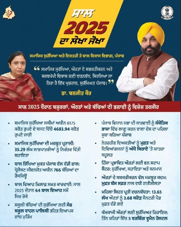 ਮੁੱਖ ਮੰਤਰੀ ਭਗਵੰਤ ਸਿੰਘ ਮਾਨ ਦੀ ਅਗਵਾਈ ਹੇਠ, ਪੰਜਾਬ ਸਰਕਾਰ ਸਮਾਜ ਦੇ ਹਰ ਵਰਗ ਦੀ ਭਲਾਈ ਲਈ ਲੋਕ-ਪੱਖੀ ਨੀਤੀਆਂ ਨੂੰ ਲਗਾਤਾਰ ਲਾਗੂ ਕਰ ਰਹੀ ਹੈ। ਸਾਲ 2025 (ਵਿੱਤੀ ਸਾਲ 2025-26) ਦੌਰਾਨ ਬਜ਼ੁਰਗਾਂ, ਔਰਤਾਂ, ਬੱਚਿਆਂ ਅਤੇ ਅਪਾਹਜਾਂ ਦੀ ਸਮਾਜਿਕ ਅਤੇ ਆਰਥਿਕ ਸੁਰੱਖਿਆ ਨੂੰ ਯਕੀਨੀ ਬਣਾਉਣ ਲਈ ਕਈ ਮਹੱਤਵਪੂਰਨ ਪਹਿਲਕਦਮੀਆਂ ਕੀਤੀਆਂ ਗਈਆਂ ਹਨ। ਇਹ ਜਾਣਕਾਰੀ ਸਮਾਜਿਕ ਸੁਰੱਖਿਆ, ਮਹਿਲਾ ਅਤੇ ਬਾਲ ਵਿਕਾਸ ਮੰਤਰੀ ਡਾ. ਬਲਜੀਤ ਕੌਰ ਨੇ ਦਿੱਤੀ।